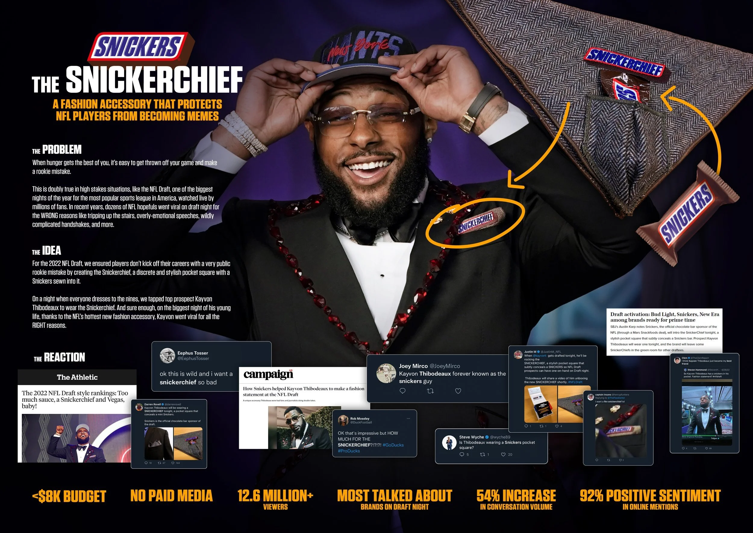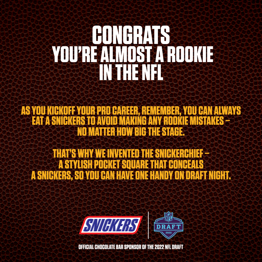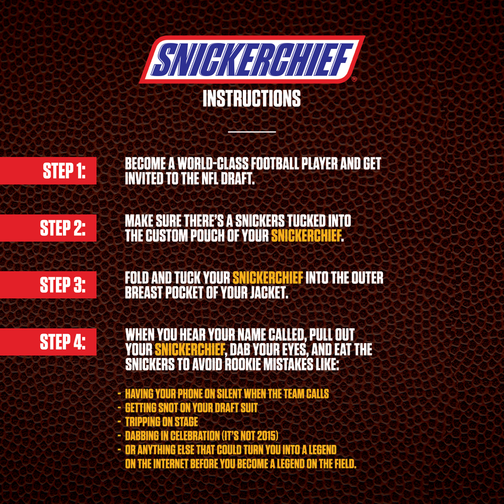 To make sure the players on draft night taking the stage that night didn’t kickoff their careers with a rookie mistake - we created the SNICKERCHIEF, a stylish pocket square with a Snickers sewn into it.